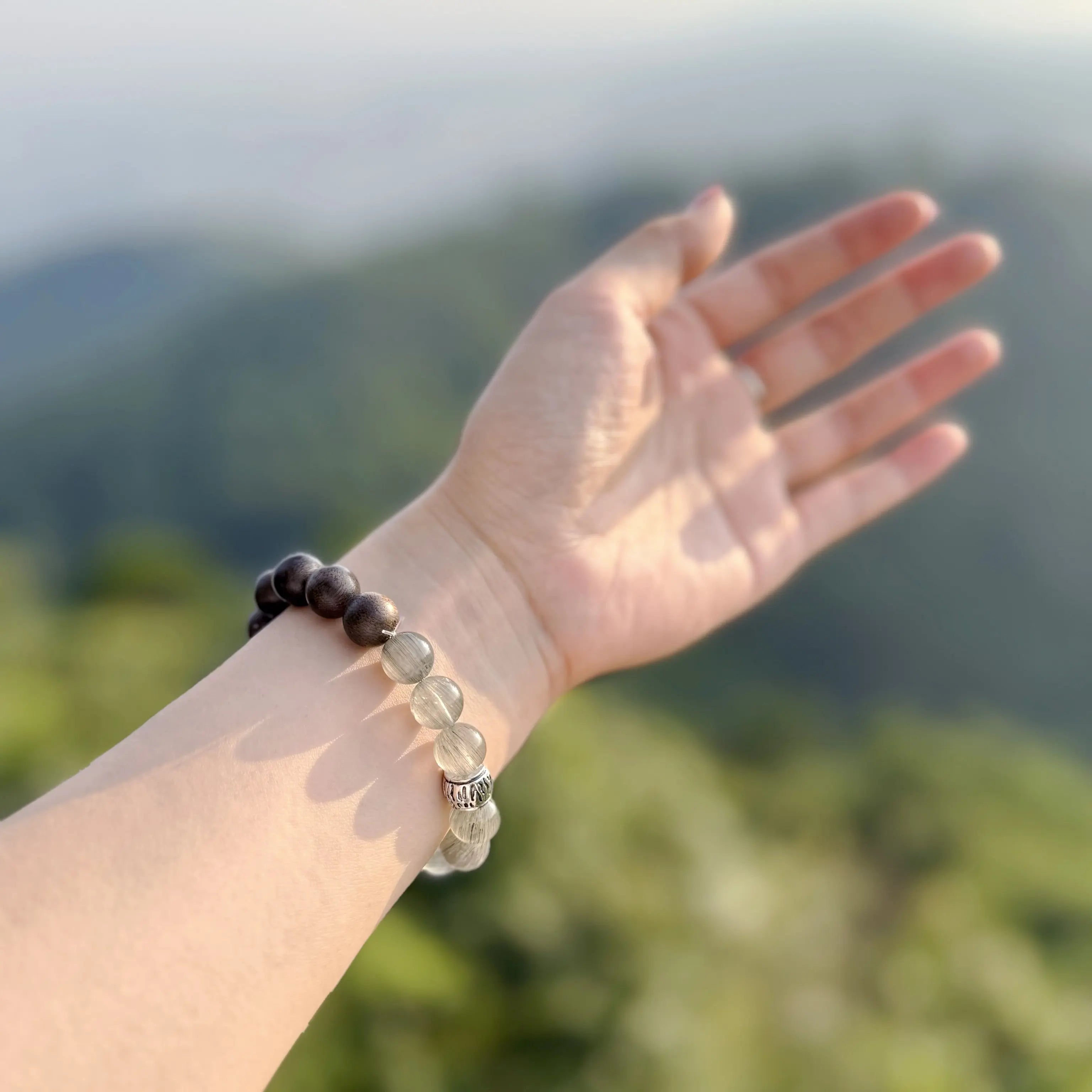 Handcrafted with natural Blue Phantom Quartz beads and Agarwood beads, this bracelet features alternating beads for an elegant and grounding design. The Blue Phantom Quartz is translucent with thread-like inclusions, while the Agarwood beads are deep brown with visible natural textures, emitting a subtle fragrance. The combination creates a powerful yet soothing energy.